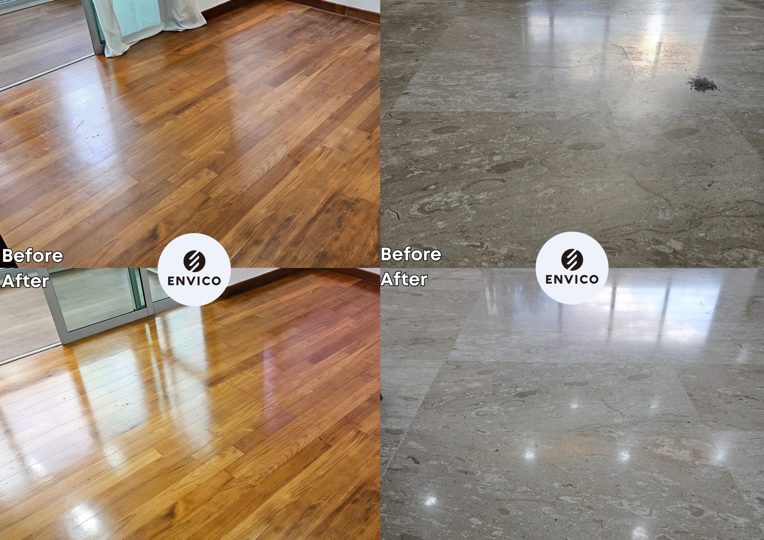Envico provide floor waxing or floor polishing services after deep cleaning your floors. The specialised treatment helps to refresh your floor and make it shine. This process is designed to renew the appearance of dull, scratched looking flooring. Layers of floor protection coating will be applied to the deep cleaned flooring. Not only will the coating make the floor shine, but it will also protect it from scratches and stains. However not all types of floors can be polished or waxed.