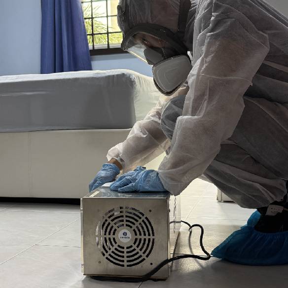 After completing the mould cleaning and containment process, our team will proceed with several levels of mould decontamination treatments. Since mould is microscopic and the air conditioning system has the highest possibility of getting contaminated, we use various decontamination machines to eliminate airborne mould and target hard-to-reach areas or those that require stronger log kill.